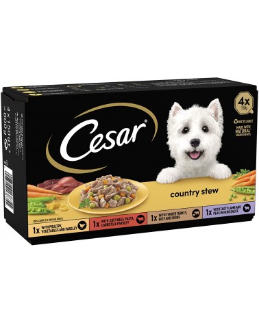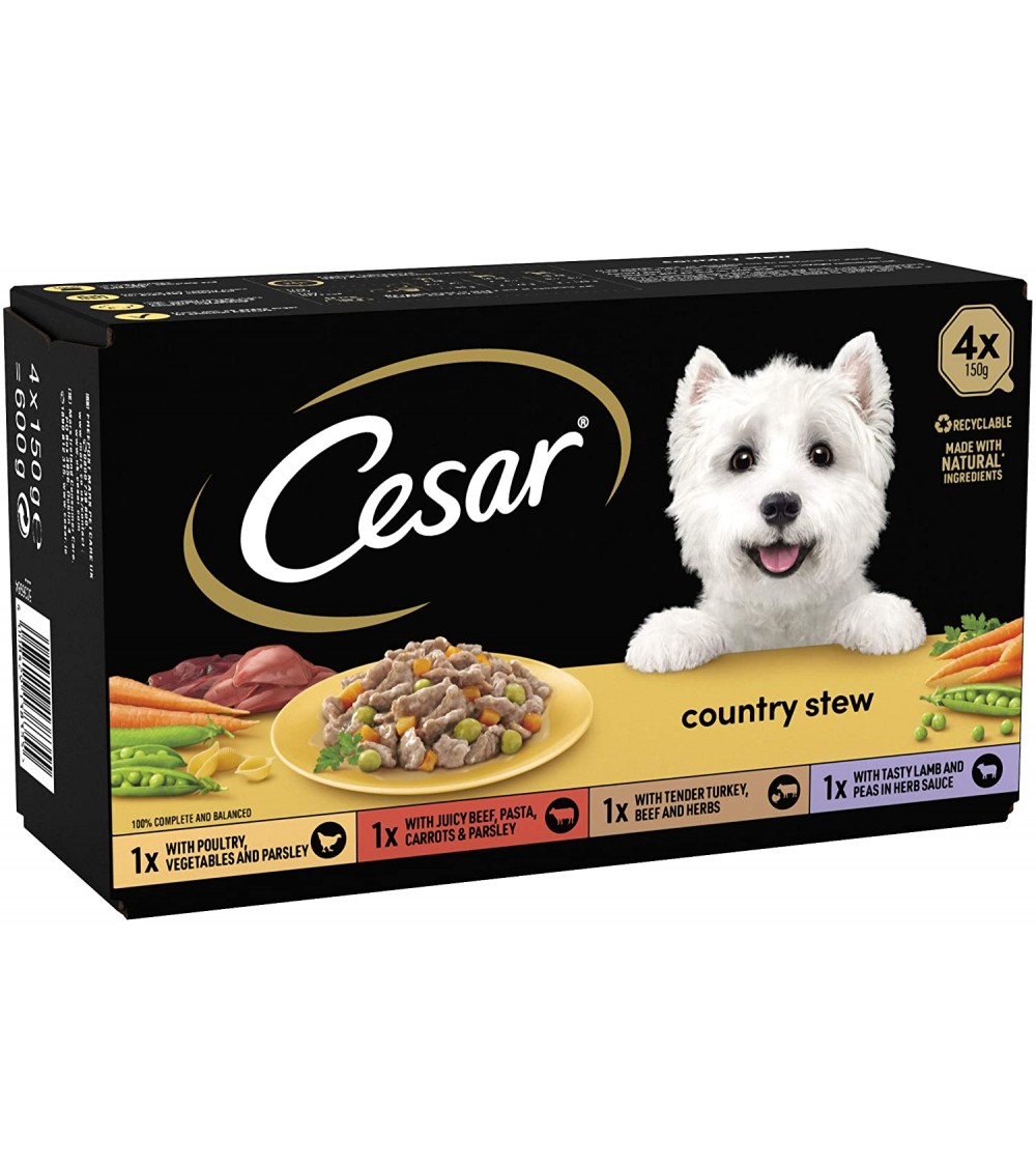 - Cesar Country Stew dog food tray includes four classic complete dog food options: tender Turkey, Beef and Herbs Poultry, Vegetables and Parsley, juicy Beef, Pasta, Carrots and Parsley,Chicken,Tomato and Herbs