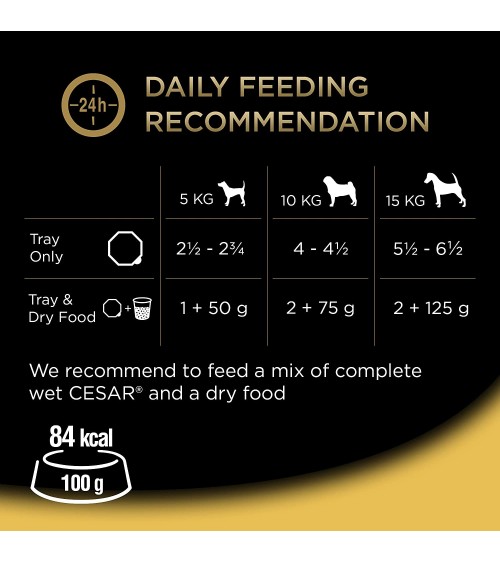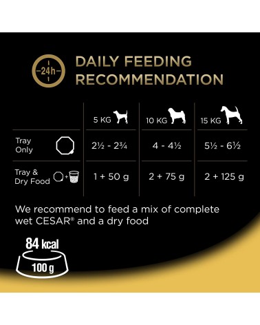 - No added sugar, artificial colours or flavours. Just pure, tasty tender mixed Cesar dog food