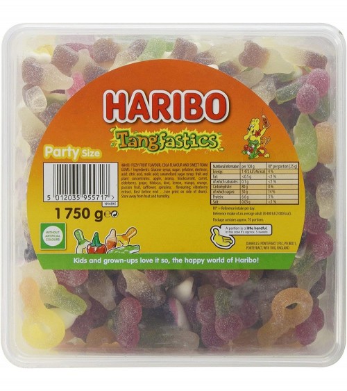 Indulge in the tangy and exciting taste of Haribo Tangfastics - a delightful assortment of sour sweets that will keep your taste buds tingling! This tub contains a generous 1.75kg of Tangfastics, making it perfect for sharing at parties, events, or simply for stocking up on your favorite sour treats. Tangfastics are a beloved classic, featuring a mix of sour gummies, fizzy cola bottles, sour cherries, sour dummies, and more. Each sweet is bursting with tangy flavor that will leave you craving for more. Whether you're a fan of sour candies or looking to surprise your guests with a unique treat, the Haribo Tangfastics Bulk Sour Sweets Tub is the ultimate choice for tangy fun!